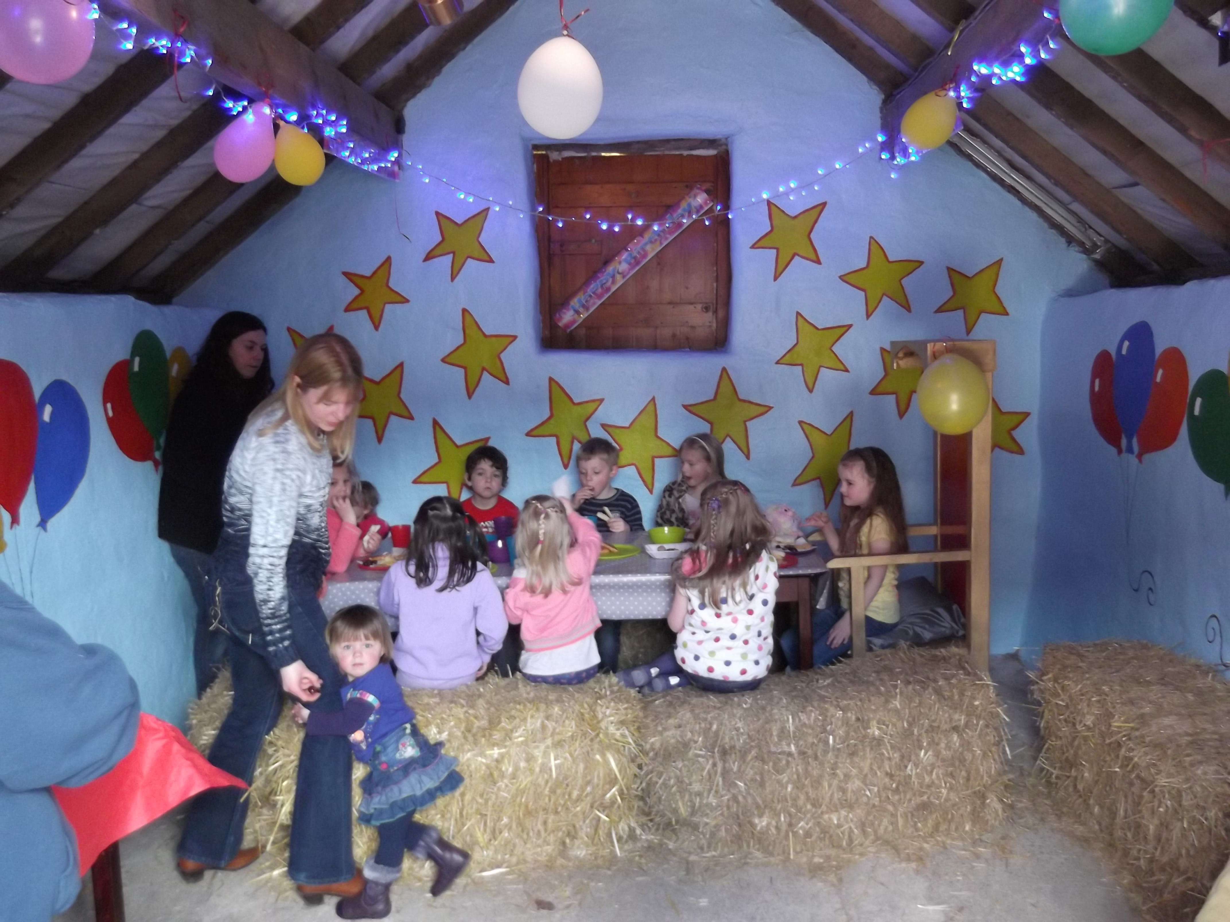 Our stable provides the perfect ‘den’ for the party tea. It is decorated with fairy lights, birthday banners and balloons and the children soon make themselves at home, sitting on straw bales . Suitable for 2-10yrs old